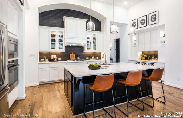 MLS# 1544392 - Built by Highland Homes - CONST. COMPLETED May 25 ~ Beautiful single-story home features an open concept living area with soaring ceilings and tall windows. Two additional living spaces include an entertainment room and separate study. The gourmet kitchen offers a wine hutch, ample storage, separate vent hood and oversized island. Elegant details in the kitchen also include painted white cabinets featuring glass doors, quartz countertops and upgraded backsplash. Relax on an oversized covered patio looking out to a private Greenbelt. Hill country brick and stone elevation offers great curb appeal. Fine details throughout...too many to list! This home is a must see
